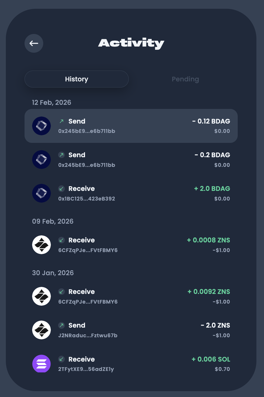 .zelfor.bdaghandle to simplify address sharing. No more long, confusing hex strings! - User-Friendly Interface: Experience the cleanest UI for managing your crypto assets.