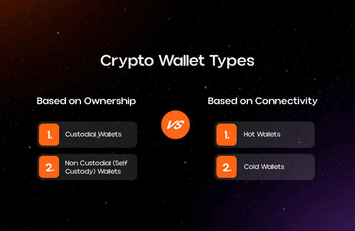 At its core, a crypto wallet is a bridge between the user and the blockchain networks. Whoever controls the cryptographic keys controls the assets. Based on this single principle, crypto wallets are categorized in two ways: by ownership and by connectivity.