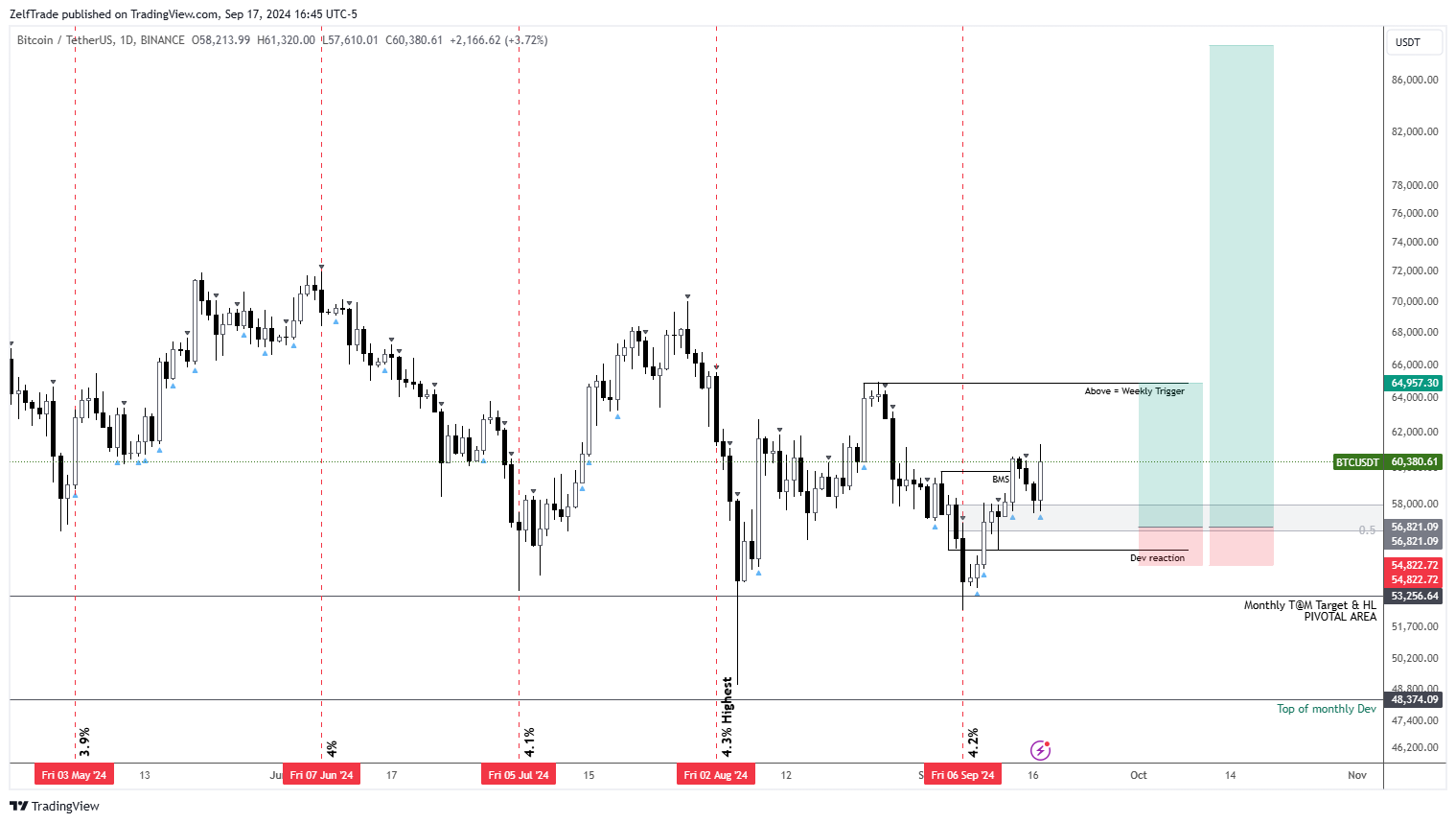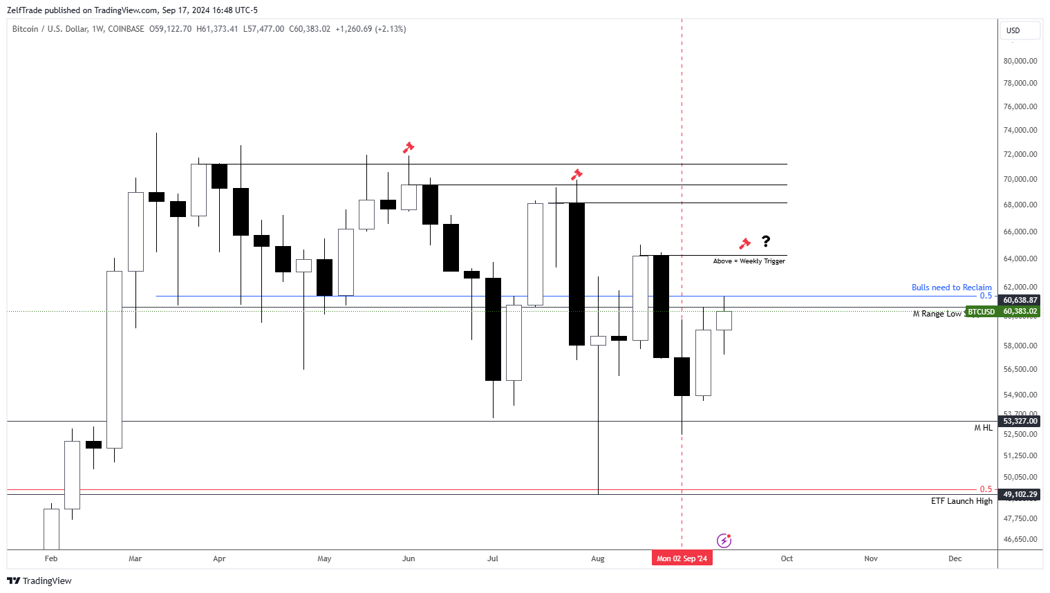 As we approach the FOMC meeting, it is crucial to deleverage as much as possible, given the uncertainty surrounding market reactions. Market participants are already anticipating a 50 basis point cut, which has driven traditional finance (TradFi) to new highs and pushed Bitcoin back into a safer zone, or just below the pivotal area. I won’t become optimistic until later in the week if the market confirms a return to a trending phase.