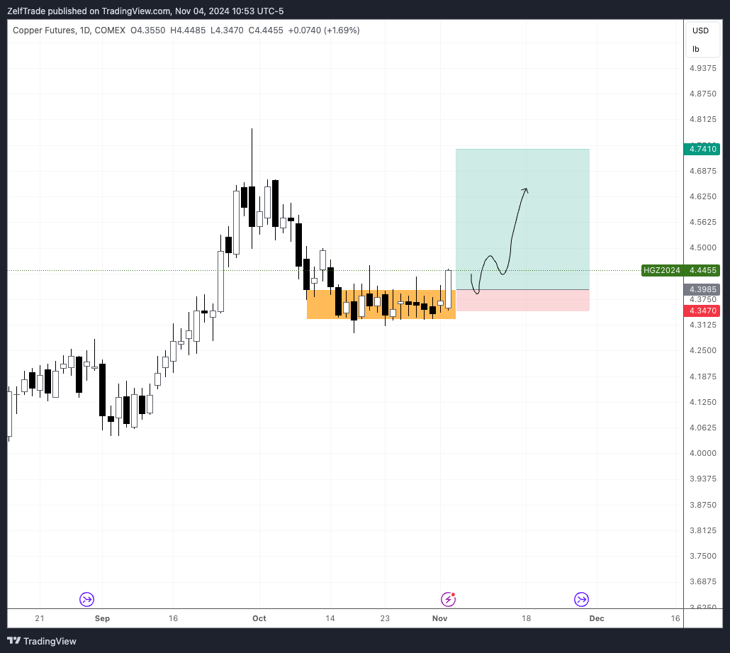 Bullish break about to confirm on today's daily close. Ideal entry at around $4.4 although a market buy is also looking well. Stop placed at today's daily low.