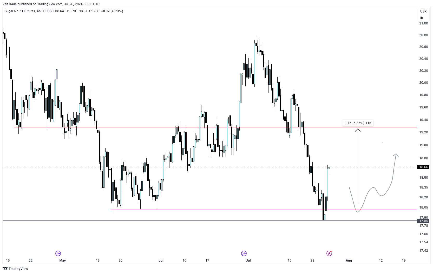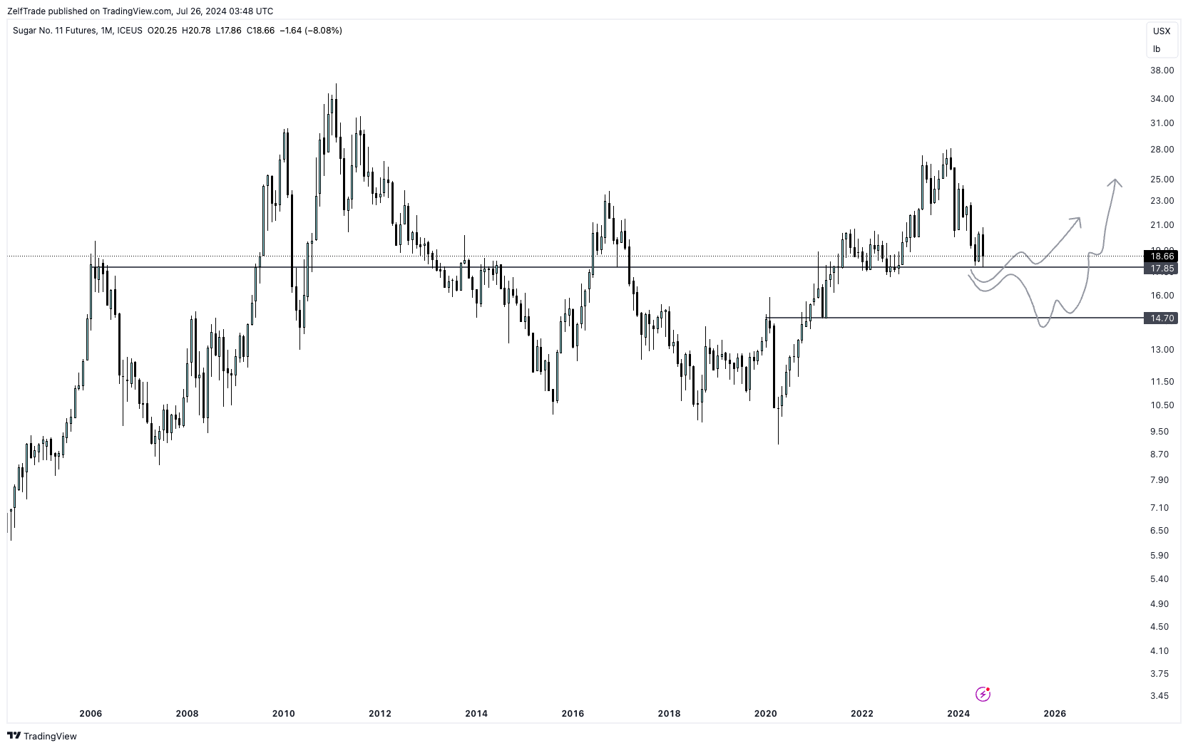 - From a monthly timeframe sugar is BULLISH nonetheless it looks like it might be holding on thin air right now. It has retraced quite a bit and is currently at a massive support and resistance level.