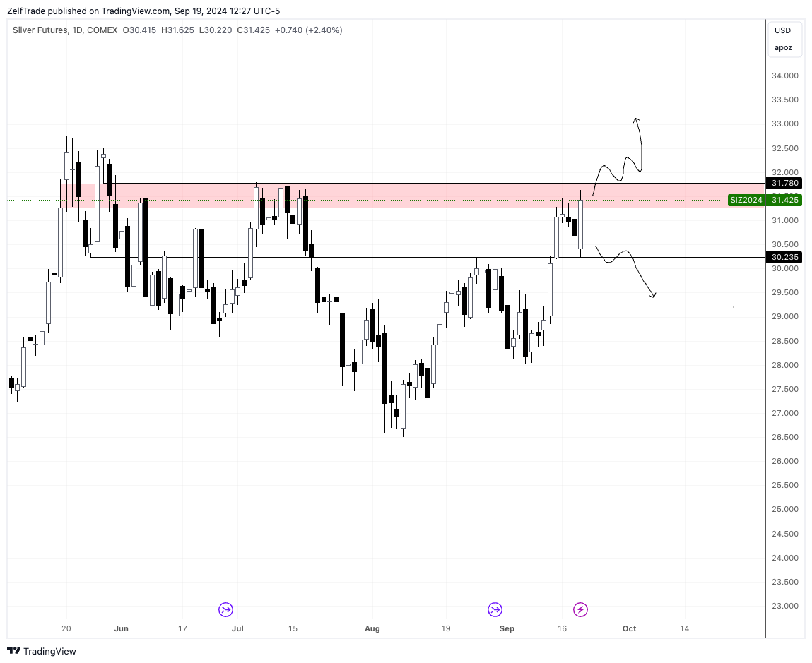 Gold (XAU) Macro = bullish / short term = neutral Today’s daily chart close is crucial. We are currently at resistance from previous highs and need a strong price move above $2,530 for bulls to regain control. Must hold level above $2,500’s. Silver (XAG) Macro = bullish / short term = neutral Yes