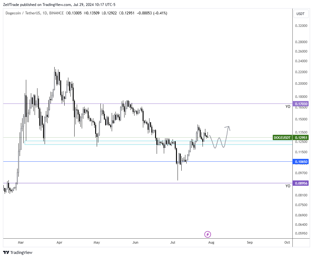 The lower time frames remain too congested and directionally unbiased, as it has been stuck in a trading range since March. Things are looking considerably better after the monthly block recovery at $0.12-0.13, but this still appears to be a slow mover compared to other memes.Â