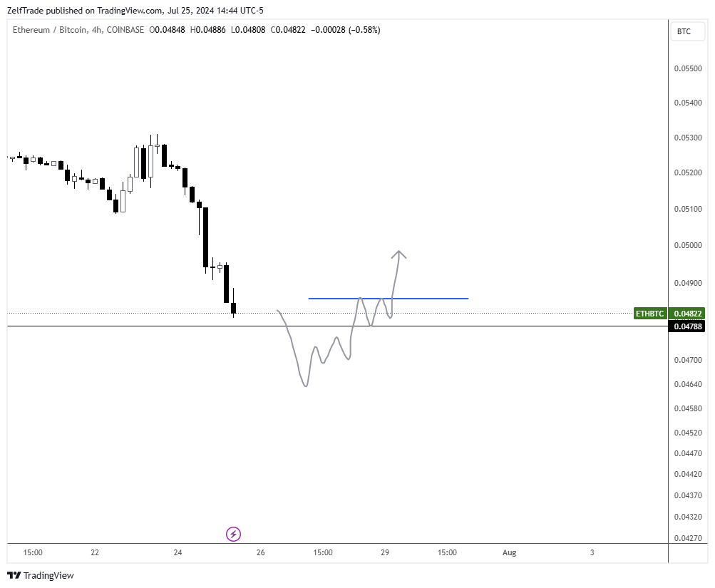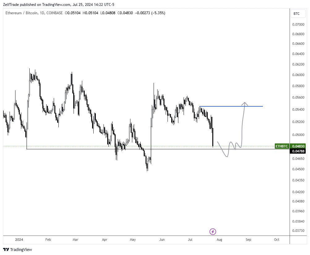 ETHBTC, at the same point as the USD chart. This presents a great opportunity as the last level for bulls to step up their game, and defend this level - I would not want to see new lows if I was an ETH Maxi!