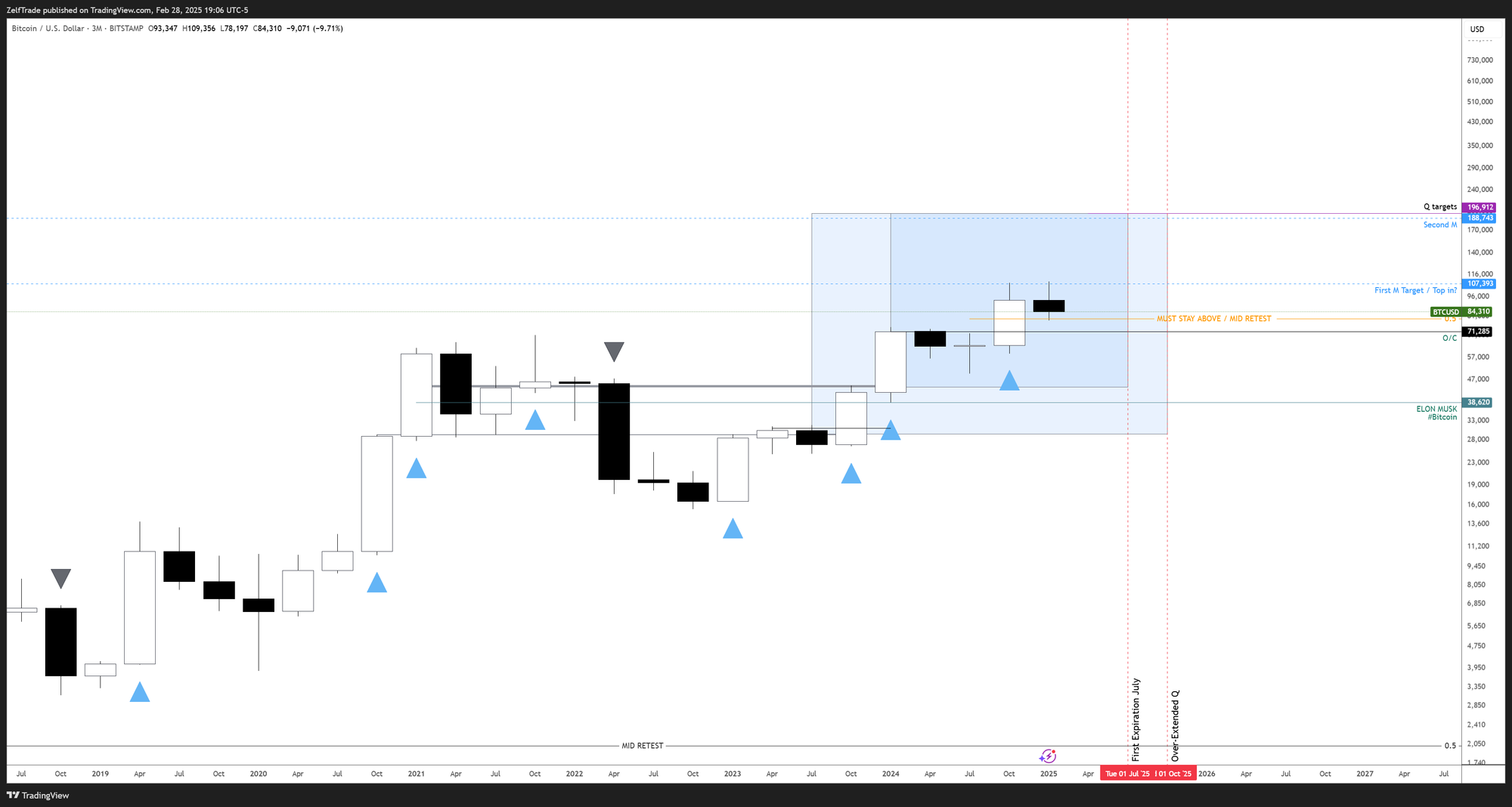 While this chart isn't a perfect match, it clearly shows that the trend remains intact. We’re currently testing the mid-level of the expansion bar around $78k, similar to what we saw throughout the 2015-2017 cycle. This could be a typical retest, and historically, these retests have led to continuation. So, while the trend is still active, that doesn't necessarily mean we’ll see exponential growth in the short term. The first expiration date for this trend is in July 2025, which gives us some time to observe how things develop.