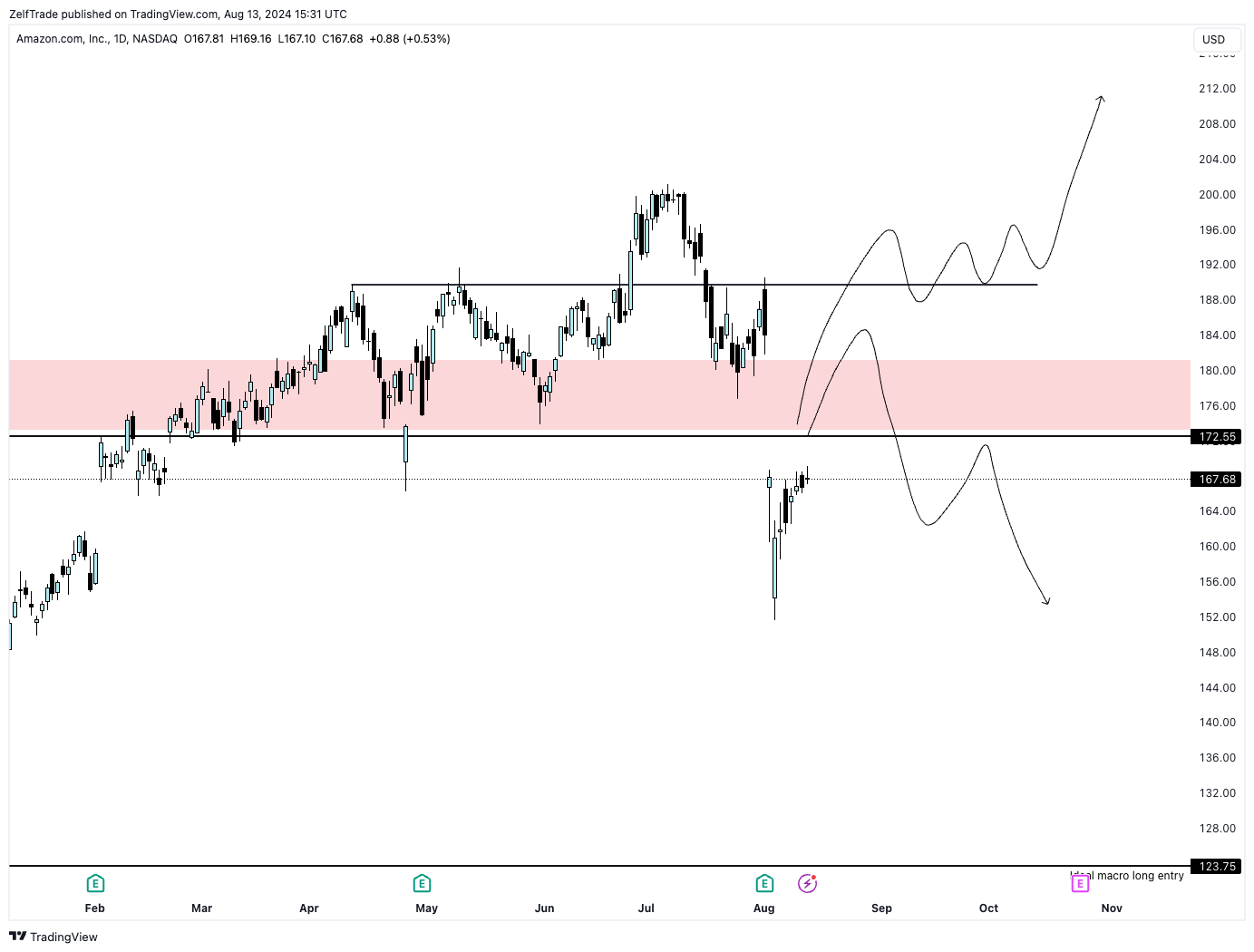 Bearish idea remain, there’s not much to do right now. Extremely slow price action. Short term, it is likely we’ll bounce towards $180 but keep in mind price action is completely bearish. Unless we break and find support above $190, do not expect further upside. Ideal macro long entries at around $120’s.