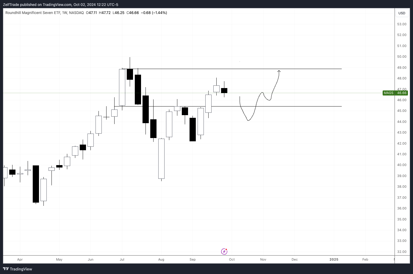 On previous reports we've been calling the return of the bulls. By looking at the Roundhill Magnificent Seven ETF $MAGS indeed look's like bulls are back based purely on market structure. We've made a lower high followed by a new higher high signaling that a trend continuation towards $49-$50 is on the way.