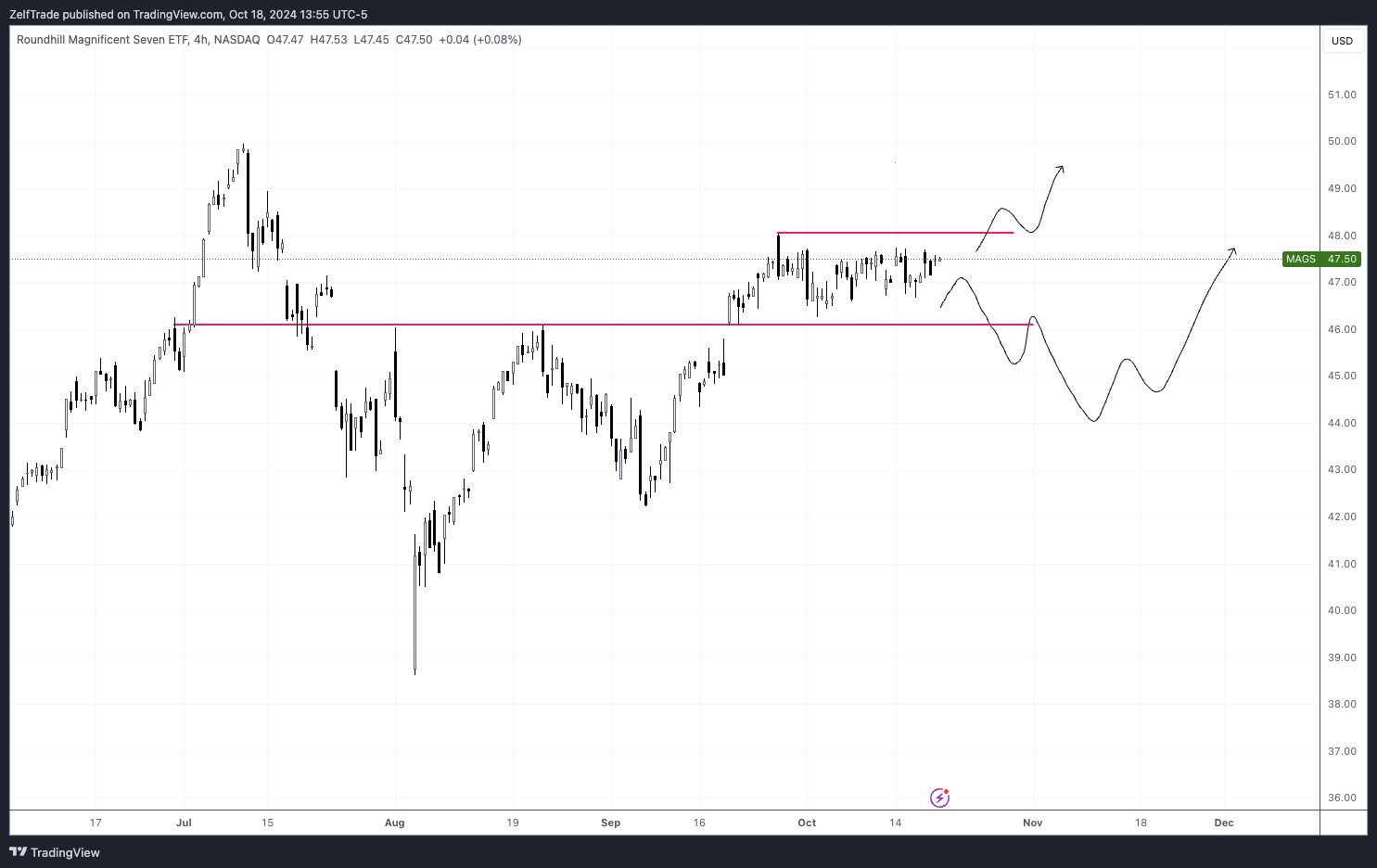 Prices across the stock market seems to be holding but the question is, FOR HOW LONG? The Roundhill Magnificent Seven ETF $MAGS do not want to fall and seem to be holding well. It is currently trading within a range. Risk on upon a strong break above and risk off