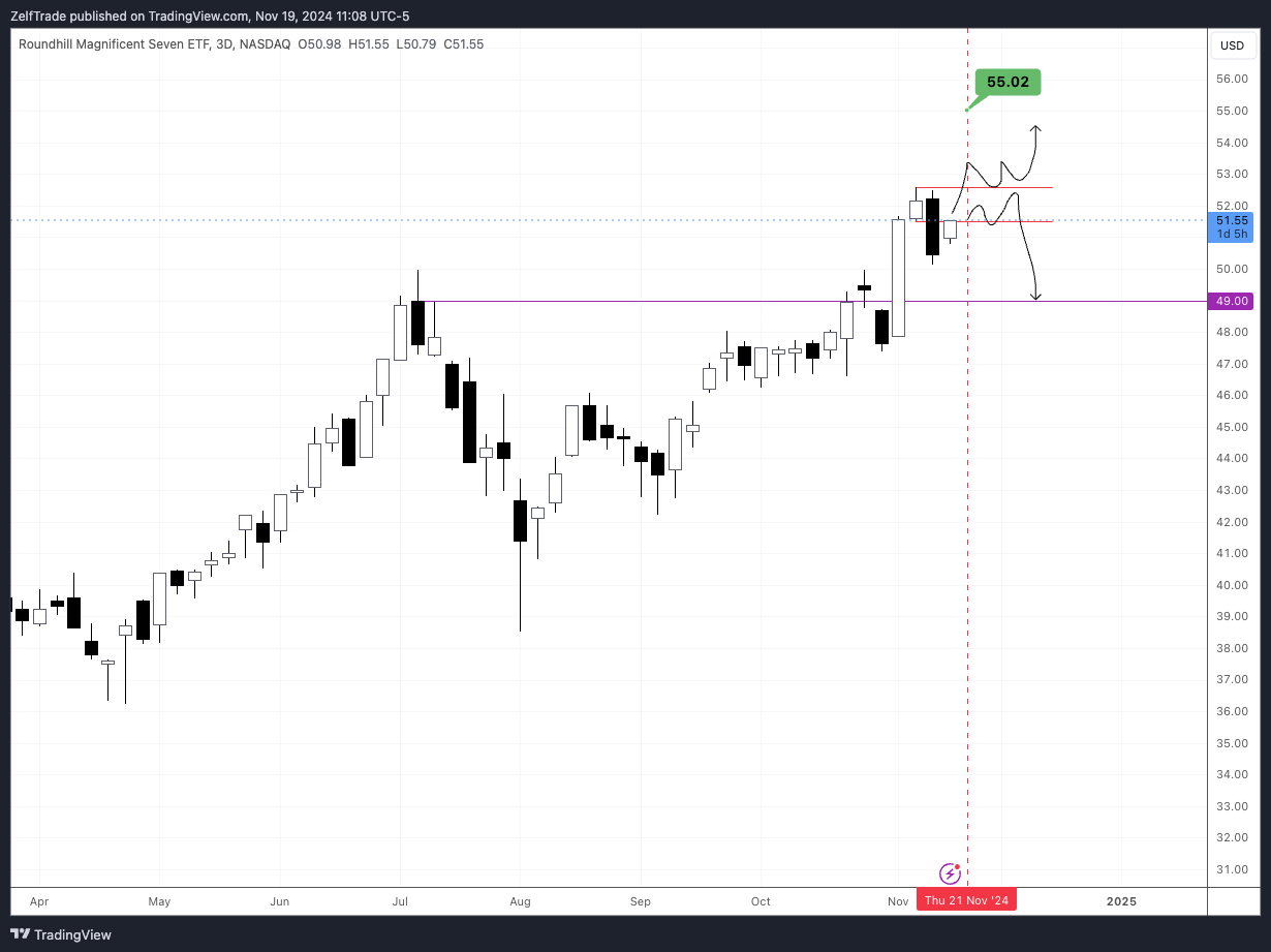 Tuesday’s long call perfectly hit as Roundhill Magnificent Seven ETF $MAGS had a massive pump after Trump’s win. It was indeed the perfect retreca before continuation. As we mentioned in our previous report, there is an active bullish trend set to expire by the end of November so embrace the