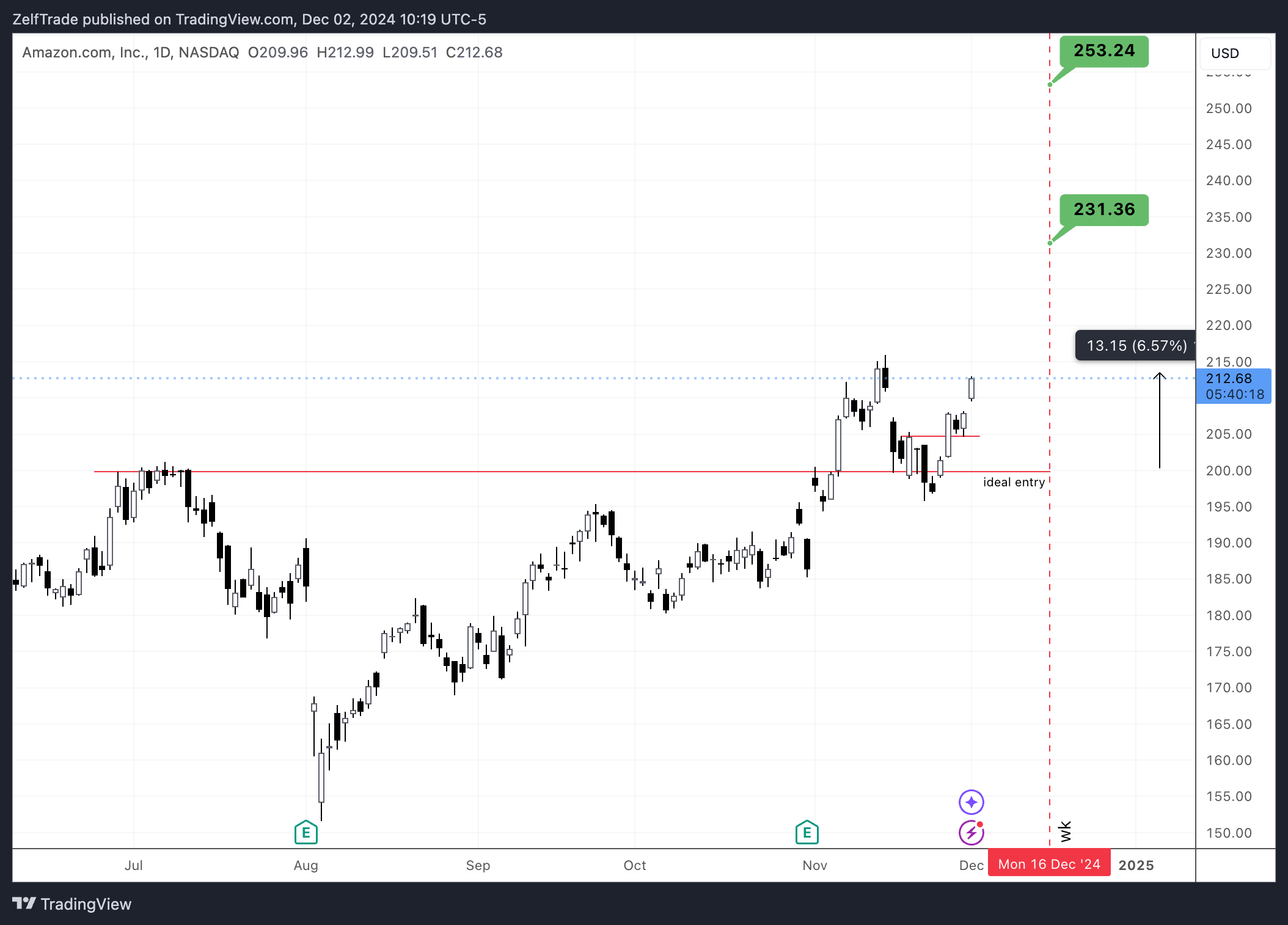 +6% up from entry as price did pumped quite quick from entry. This one has a time at mode bullish trend active till mid December with price targets of $231 and $253. A strong close above previous high is key for bullish continuation.