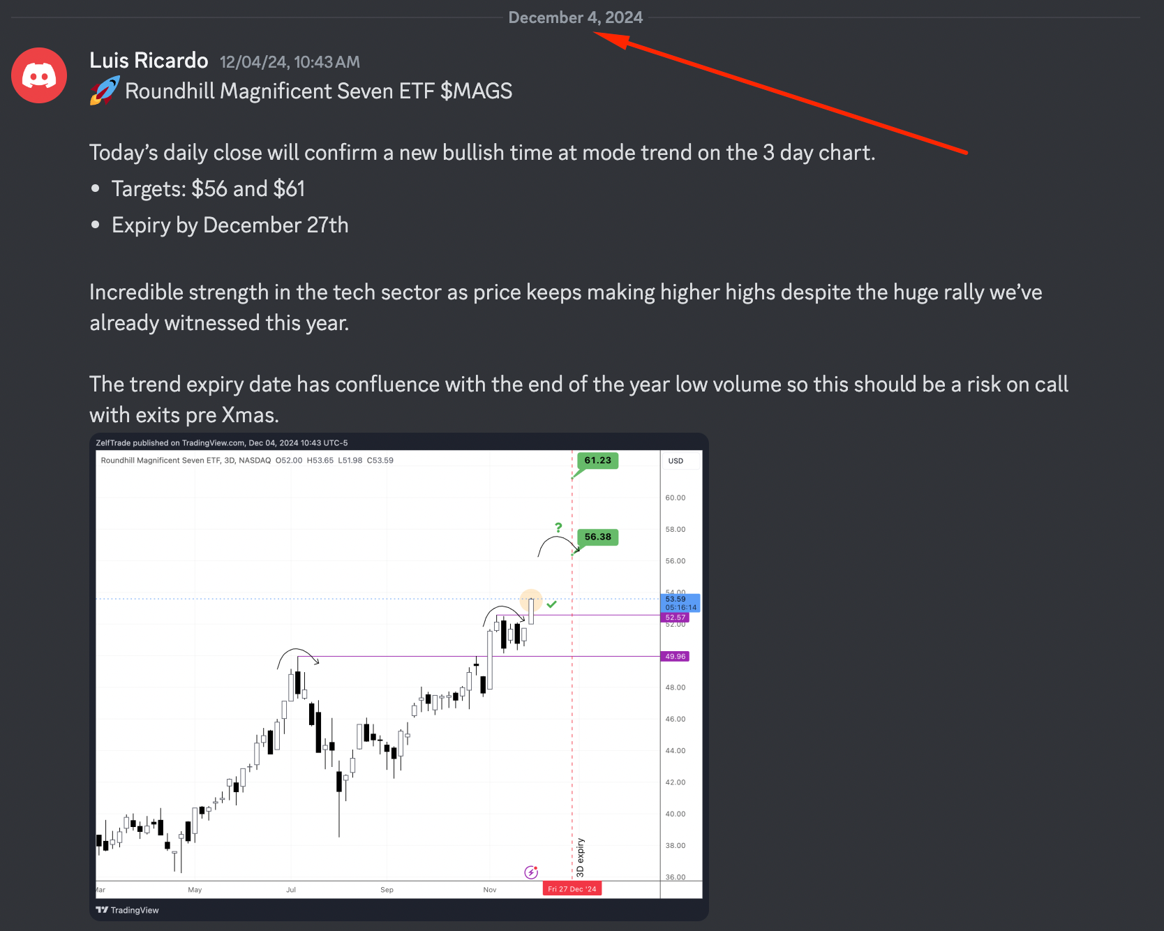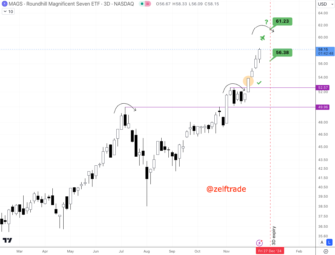 The tech sector's ON THE RUN! 6 out of 7 stocks are BULLISH. Roundhill Magnificent Seven ETF $MAGS had a perfect pump from previous entry signal as price printed a clear bullish trend confirmation. As posted on December 4th, the 3 day chart printed a bullish engulfing and range expansion candle above previous highs. This together with our time at mode methodology signaled a bullish trend confirmation with targets of $56, which we already hit and the second target of $61 which looks like we are on the way! As of right now there's no need to step off as price keeps showing strength just be careful on which stock you pick and what price you decide to jump in.