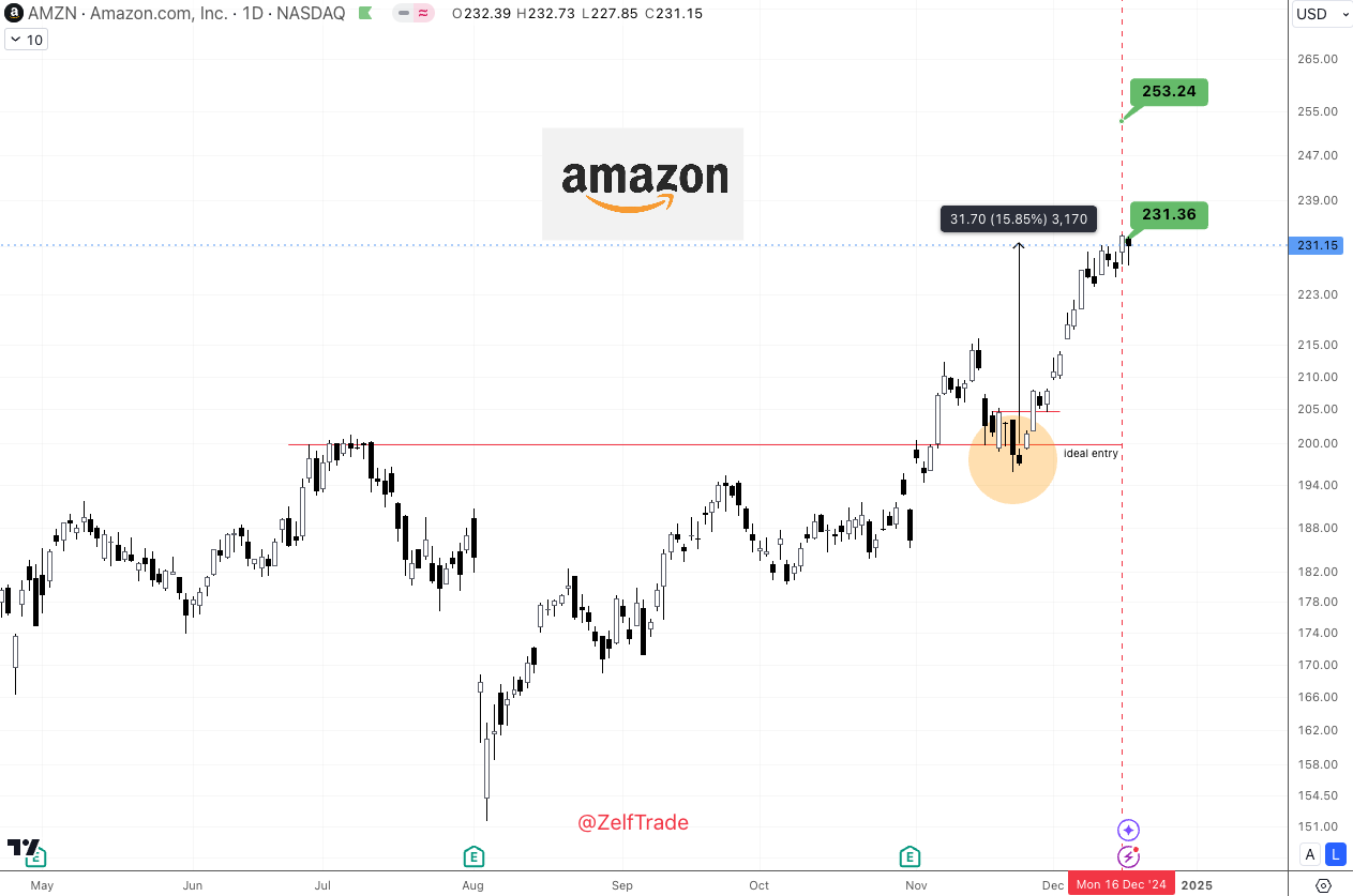 Absolutely killing it on Amazon $AMZN as well. We are almost +16% from entry and our first target just got hit. There's no weakness signs so far. Small profit might be taken but hoping for a continuation to our next target. Everything looks bullish so far but price does need to close the week strong. We'll keep monitoring and update if needed.