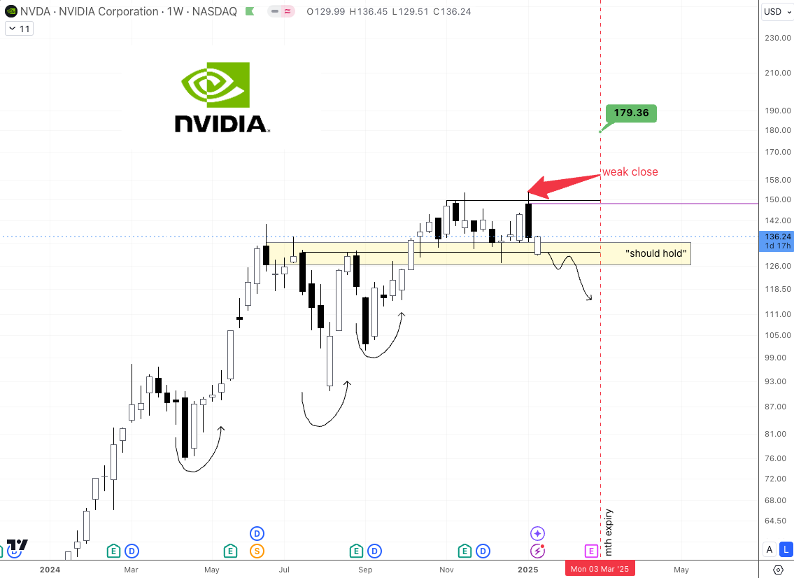 NVIDIA $NVDA price was unable to get a strong weekly close above previous all time high as we mentioned in our previous report and unfortunately we are back at support. Holding by a thread... On lower time frames, price must start showing strength back above the yearly open of $136 for further upside. Any risk adverse investors trying to profit swing trade, as long as the low of $126 holds this could be an easy trade towards high $140's.