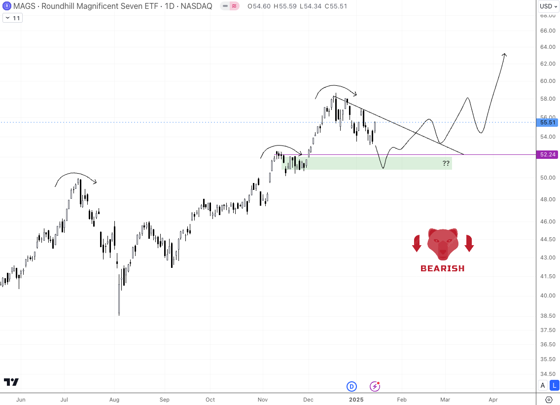 With the upcoming Trump's take office inauguration next Monday the 20th I do expect high volatility across the markets. I'm leaning bullish nonetheless not all stocks are currently pointing that way in the short term. As for Roundhill Magnificent Seven ETF, it is in a clear downtrend making multiple lower highs and lower lows. If the bearish momentum continues our next area of interest should be around $50's mark.