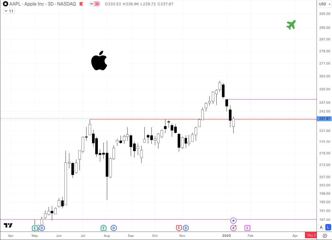 Apple $AAPL currently sitting at around the juicy buy zone and any retrace toward $220 should be dollar cost averaging your entries. This a macro must hold area before further upside.