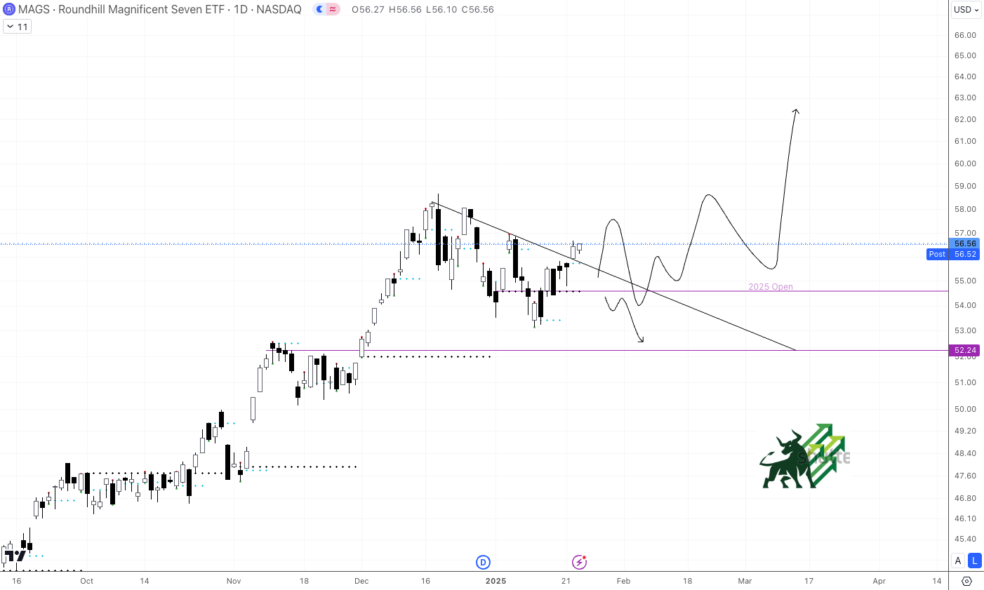 With the upcoming Trump’s take office inauguration next Monday the 20th I do expect high volatility across the markets. I’m leaning bullish nonetheless not all stocks are currently pointing that way in the short term. As for Roundhill Magnificent Seven ETF, it is in a clear downtrend making multiple lower