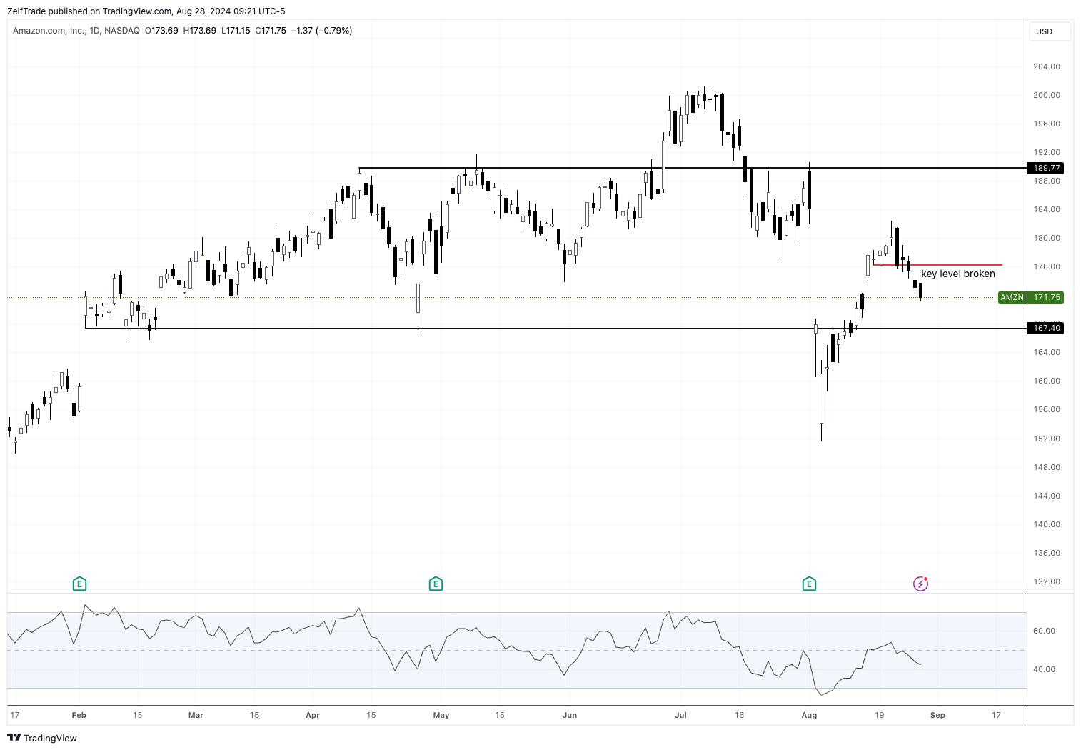Monday’s Open Roundhill Magnificent Seven ETF (MAGS) Prices have not been able to break above resistance and we just closed the daily chart on Friday with an engulfing bearish candle indicating a possible retrace so be cautious this week. Most tech stocks are showing weakness short term. Amazon.com (AMZN)