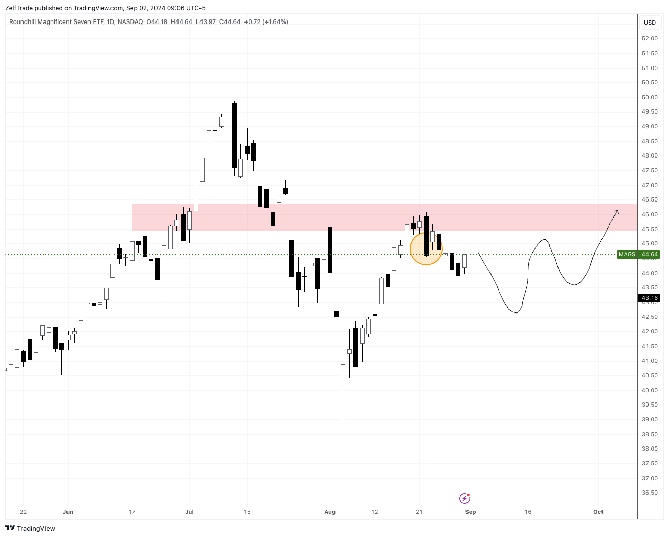 As mentioned in last Monday’s report, the MAGS etf was showing weakness and was more than likely in for a short term retrace. The retrace is now on its way. Ideally we want a continuation toward the $43 price area.Â