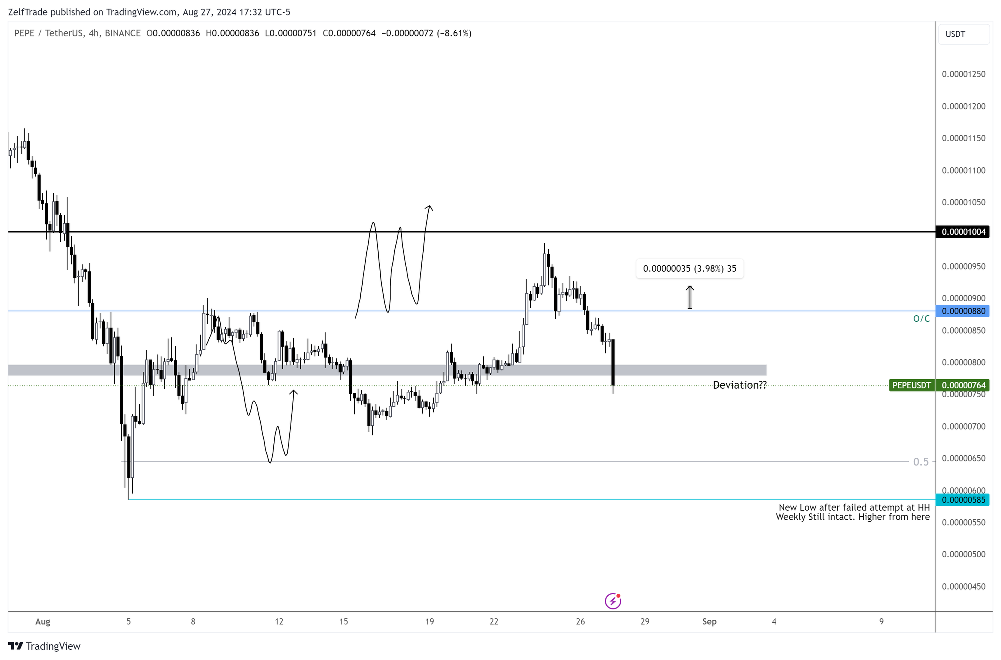 The macro picture still looks solid. As anticipated, PEPE is likely to be a slow mover, trading sideways above $0.0000072 until mid-September. Be cautious with bids, as price movements have been anemic.