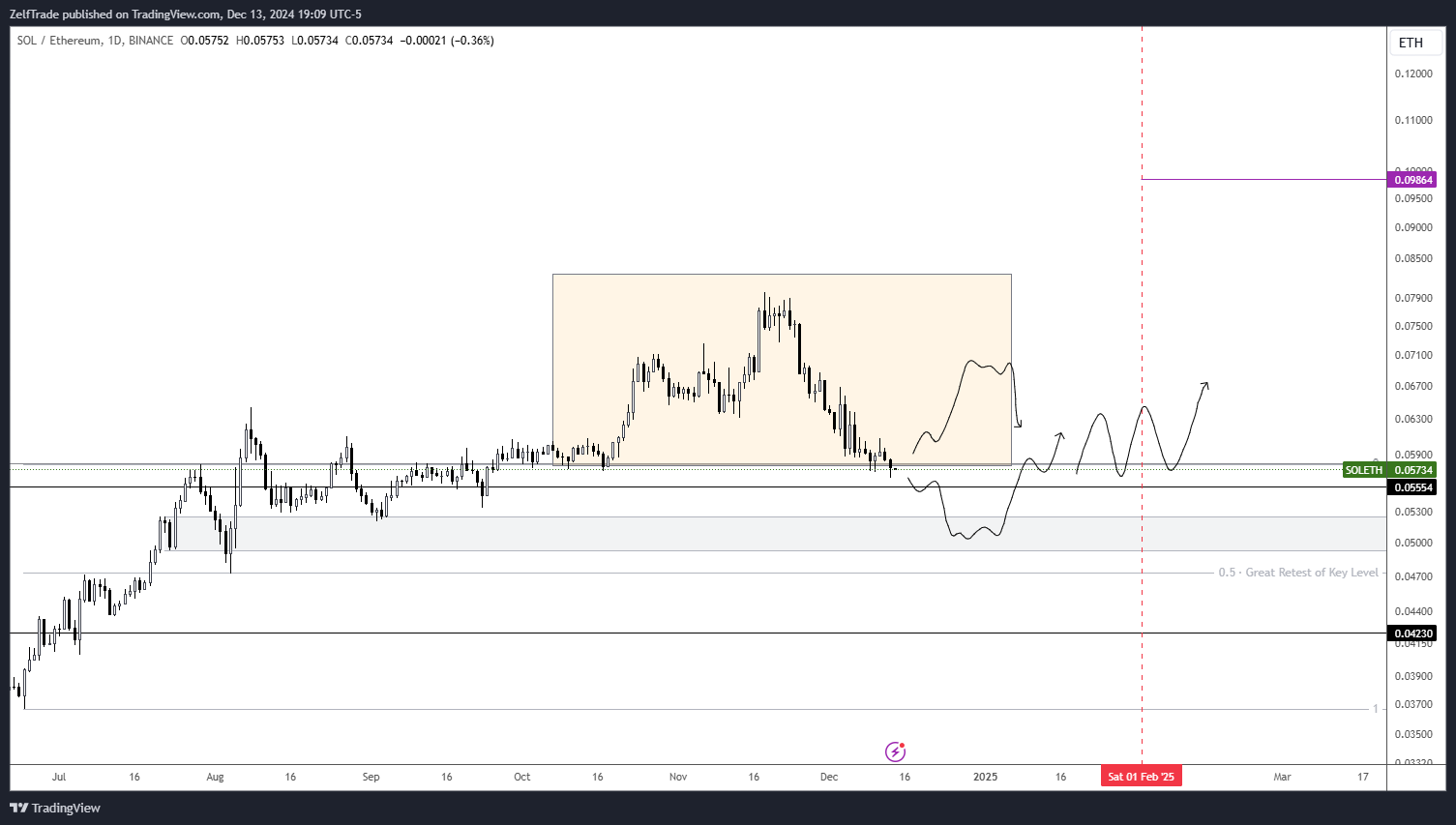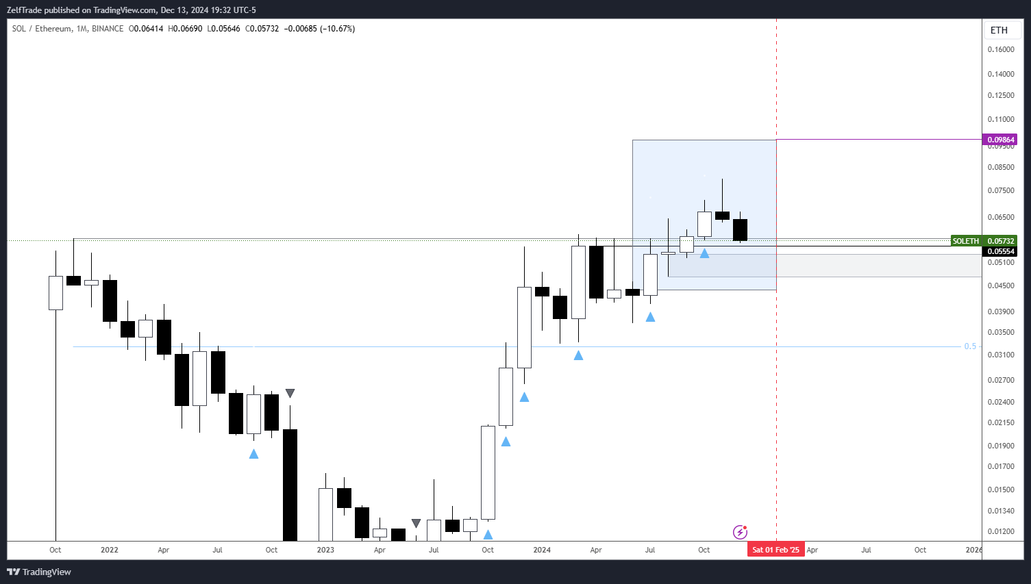 The SOLETH performance is no longer valid on the monthly timeframe. The expected trend has been invalidated, and we’re now in a consolidation phase, mirroring Ethereum’s price action. Solana is likely to range within current levels relative to ETH.