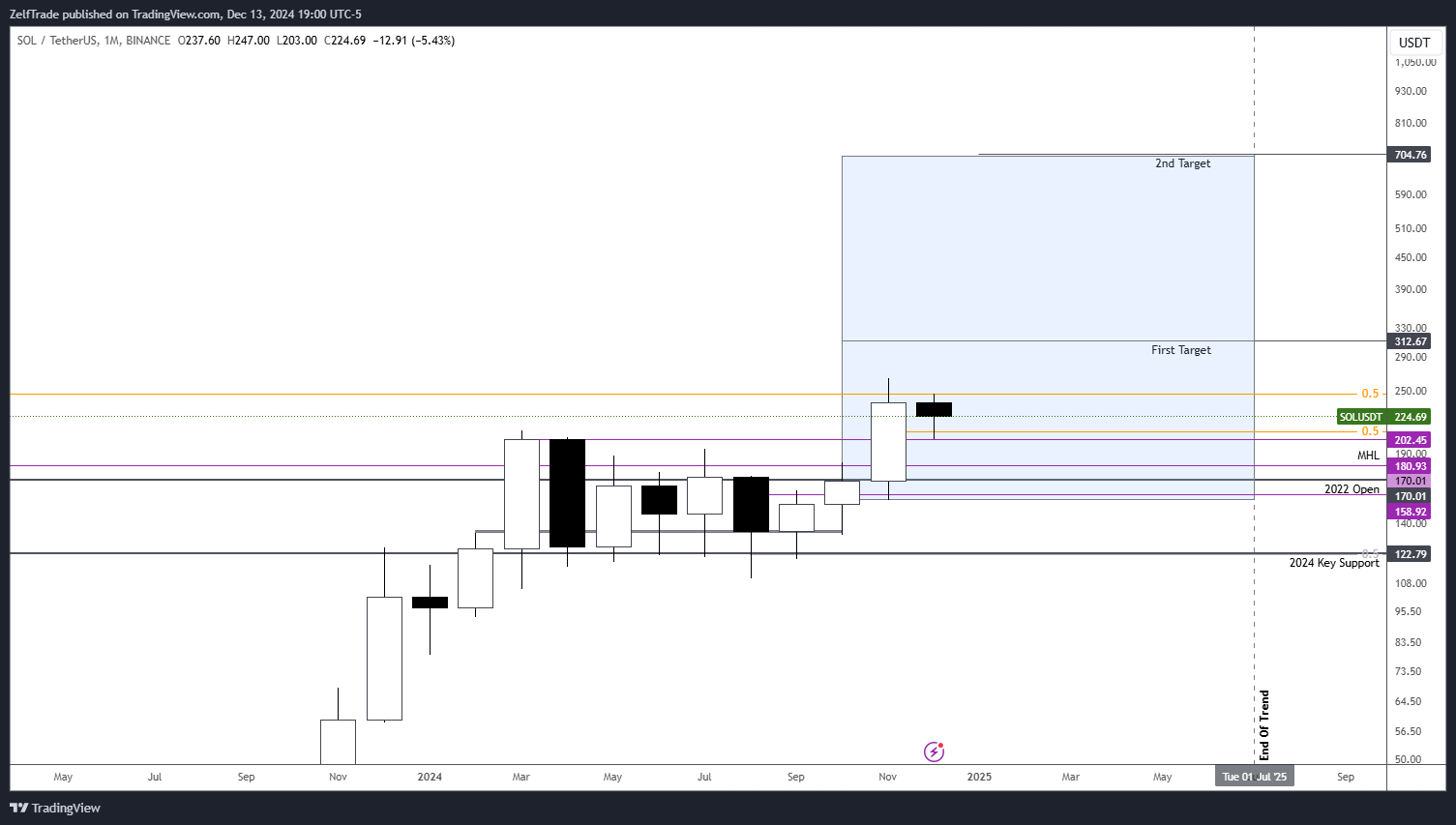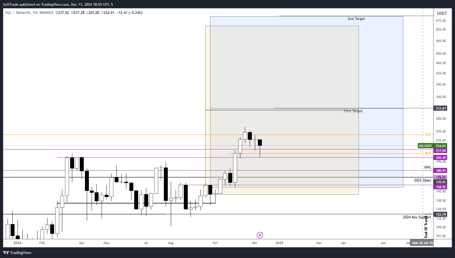 The monthly chart offers a clearer view of Solana's long-term trend. Although we didn’t close above the $246 zone as expected, we’re currently in the retrace phase for December, aligning with our original plan. The re-entry in the low $200s coincided with the second-highest monthly close historically and the mid-retracement level for November.