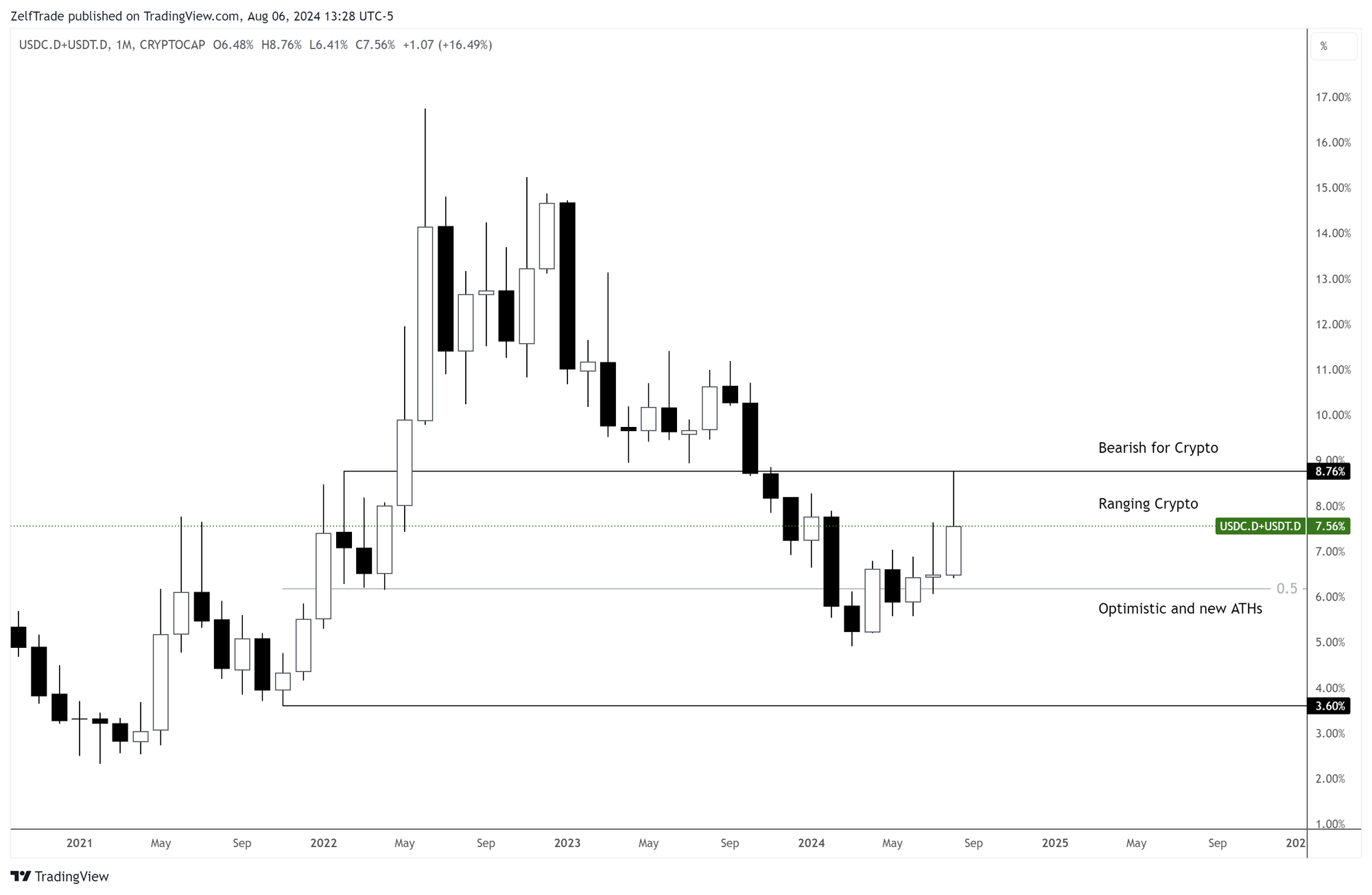 Many of the market participants have been sitting on the sidelines in stables since March '24, causing this big momentum to hit resistance directly. It doesn't hurt to point out that most of this upside move was driven by weakness in altcoins.Â